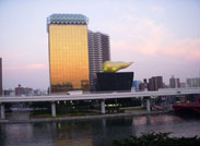 夕暮れの隅田川沿いには名物アサヒビール本社があります。